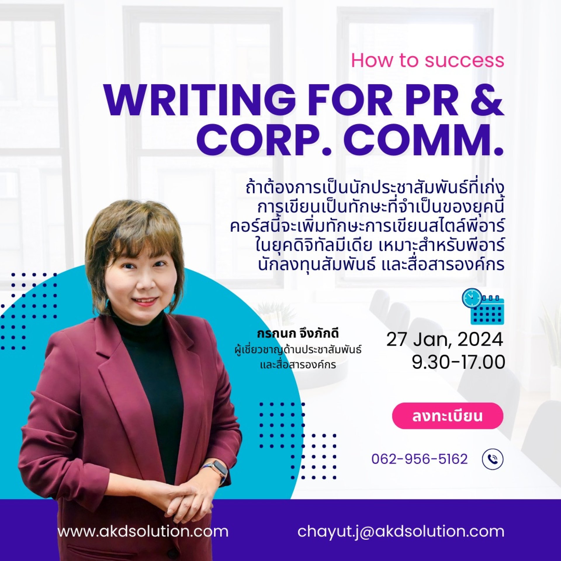 บริษัท เอเคดี โซลูชั่น จำกัด ผู้ส่งมอบความรู้ โดยผู้เชี่ยวชาญ ตอบสนองความต้องการทางธุรกิจ และมีส่วนร่วมต่อสังคมอย่างยั่งยืน ขอเชิญท่านส่งบุคลากรเข้าอบรมหลักสูตร การเขียนสไตล์พีอาร์ยุคดิจิทัลมีเดีย วิทยากรโดย อ.กรกนก จึงภักดี ผู้เชี่ยวชาญด้านประชาสัมพันธ์และสื่อสารองค์กร