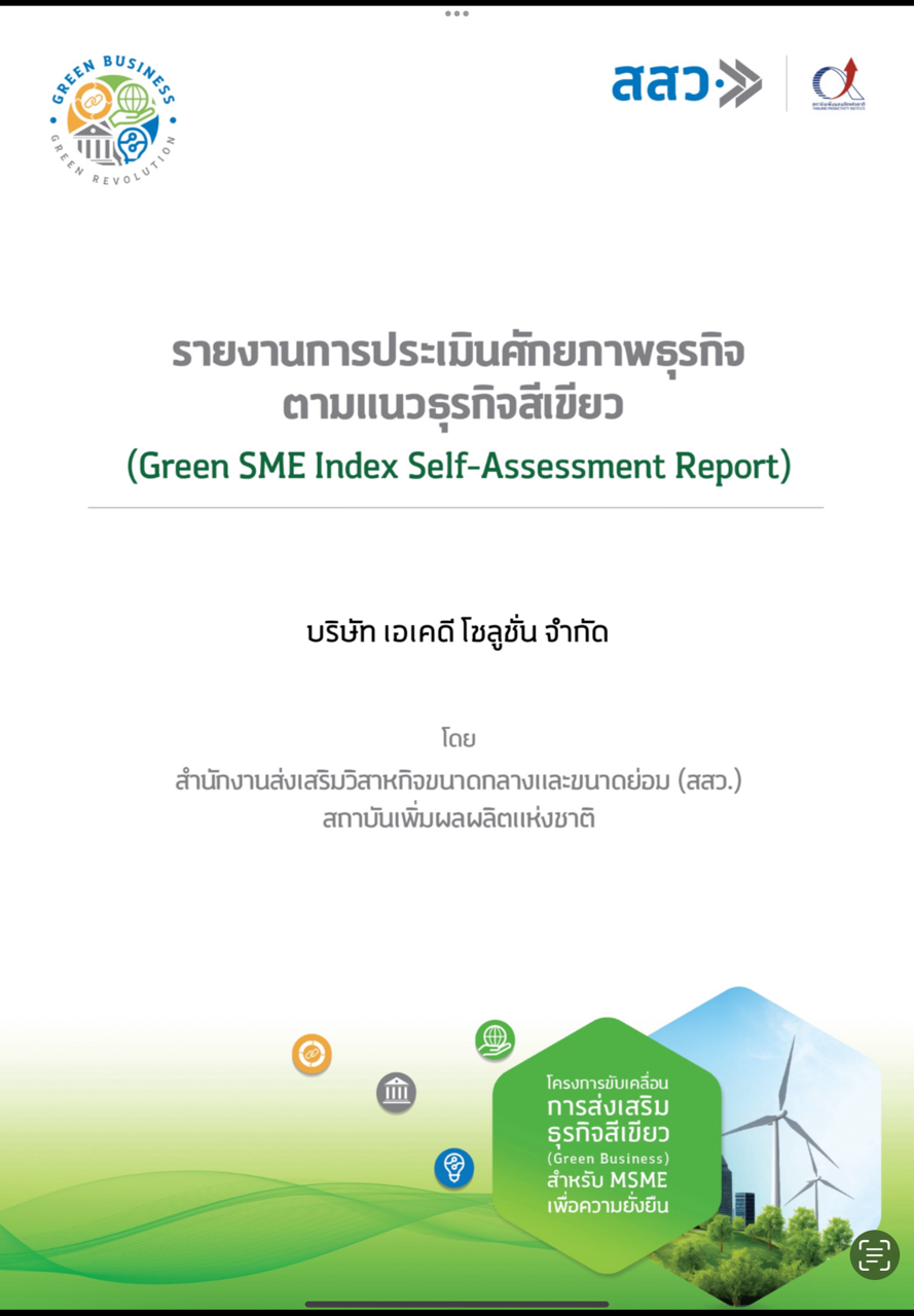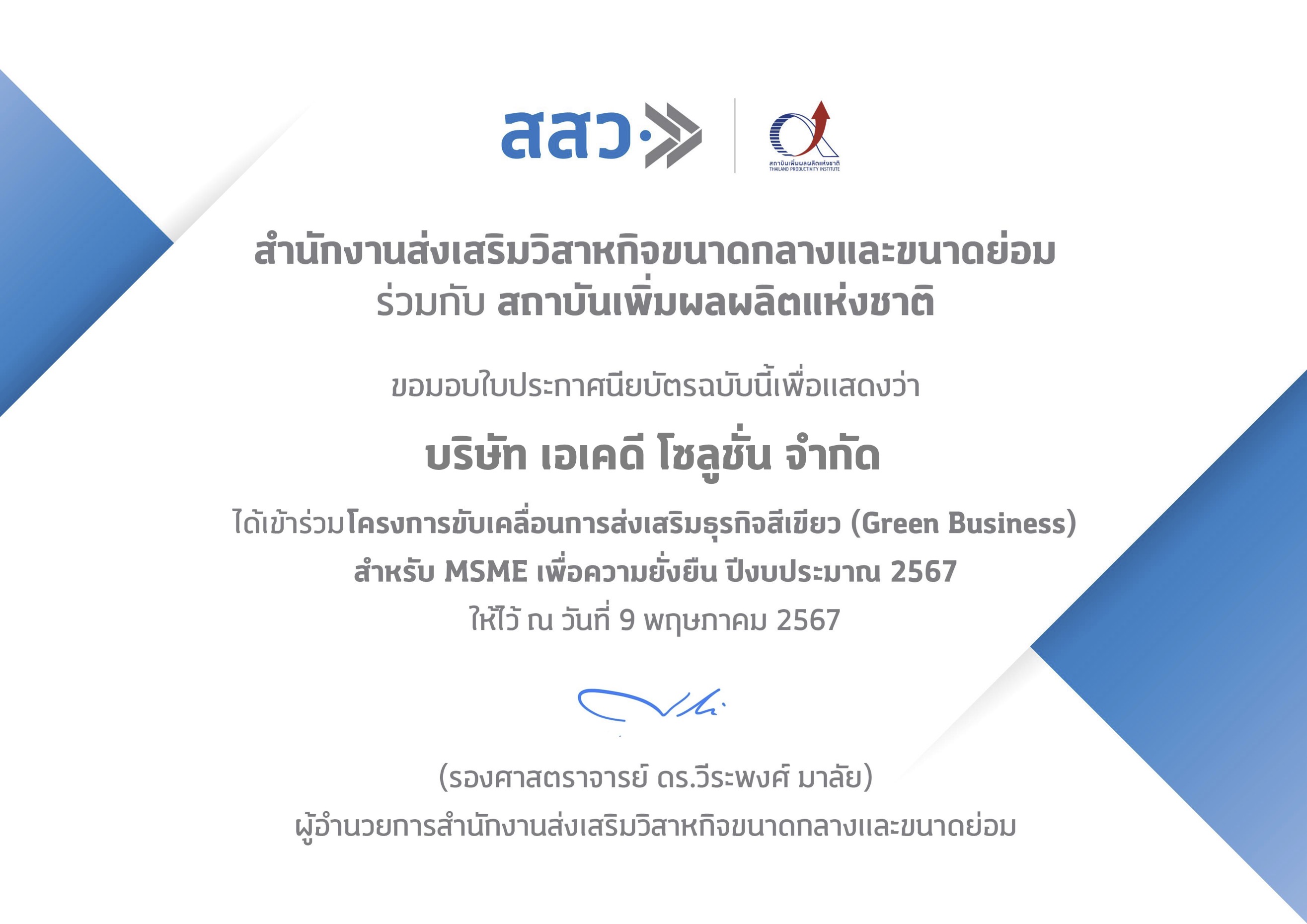 บริษัท เอเคดี โซลูชั่น จำกัด ได้รับใบประกาศนียบัตรจากสำนักงานส่งเสริมวิสาหกิจขนาดกลางและขนาดย่อม (สสว.) และสถาบันเพิ่มผลผลิตแห่งชาติ ในการเข้าร่วม โครงการขับเคลื่อนการส่งเสริมธุรกิจสีเขียว (Green Business) ด้วยความมุ่งมั่นในการดำเนินธุรกิจบนพื้นฐานของการพัฒนาความยั่งยืนที่ช่วยเสริมสร้างให้องค์กรมีการเติบโตอย่างมั่นคง ซึ่งเข้าร่วมอบรม ณ King Park Avenue Hotel เมื่อเร็วๆ นี้
