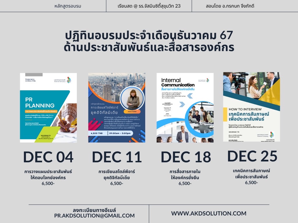 AKD บริษัทฝึกอบรมที่ #ครบเครื่องเรื่องการสื่อสารประชาสัมพันธ์ จึงขอนำเสนอตารางฝึกอบรมประจำเดือนธันวาคม 2567