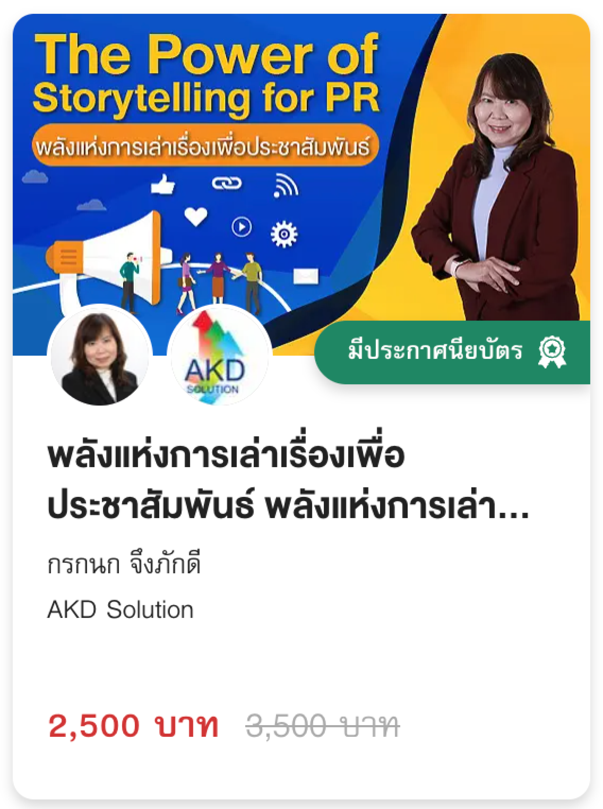 เรียนได้แล้ววันนี้ที่ skilllane คลิกลิงค์นี้เพื่อชมตัวอย่าง https://www.skilllane.com/courses/Power-Storytelling-for-PR